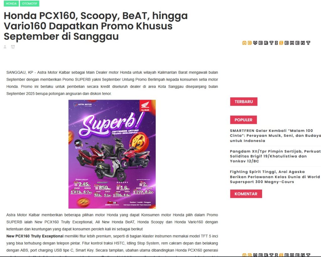 Honda PCX160, Scoopy, BeAT, hingga Vario160 Dapatkan Promo Khusus September di Sanggau