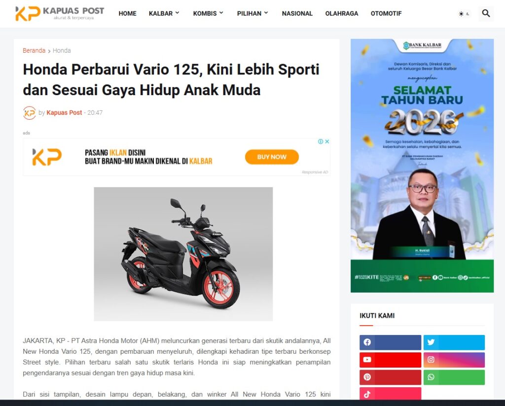 Honda Perbarui Vario 125, Kini Lebih Sporti dan Sesuai Gaya Hidup Anak Muda by Muhammad Arif 15 Januari 2026 in Silahkan kunjungi https://www.kapuaspost.web.id/2026/01/honda-perbarui-vario-125-kini-lebih.html. Tags: astra Astra Motor kalbar Astra Motor Pontianak astramotor honda kalbar pontianak sepeda motor You Might Like Regional Public Launching New ADV160 The SUV Pride Grand Launching New PCX 160 Truly Exceptional! Tetap hati-hati ya bro sist berkendara saat hujan.