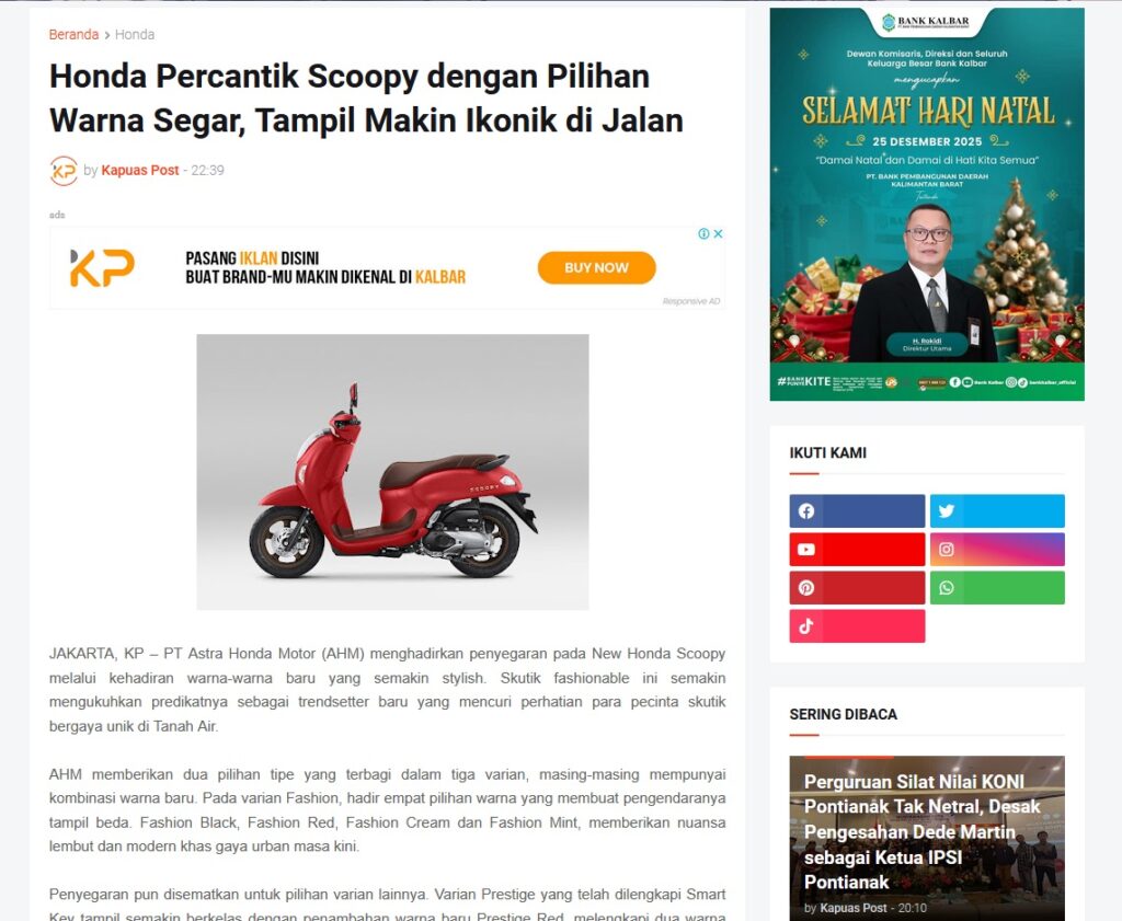 Honda Percantik Scoopy dengan Pilihan Warna Segar, Tampil Makin Ikonik di Jalan by Muhammad Arif 27 Desember 2025 in Silahkan kunjungi https://www.kapuaspost.web.id/2025/12/honda-percantik-scoopy-dengan-pilihan.html. Tags: astra Astra Motor kalbar Astra Motor Pontianak astramotor honda kalbar pontianak sepeda motor You Might Like Regional Public Launching New ADV160 The SUV Pride Grand Launching New PCX 160 Truly Exceptional! Tetap hati-hati ya bro sist berkendara saat hujan.