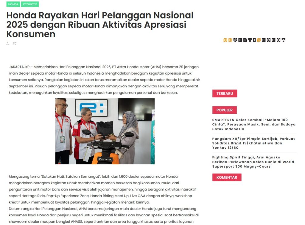 Honda Rayakan Hari Pelanggan Nasional 2025 dengan Ribuan Aktivitas Apresiasi Konsumen by Muhammad Arif 12 September 2025 in Silahkan kunjungi https://www.kapuaspost.web.id/2025/09/honda-rayakan-hari-pelanggan-nasional.html. Tags: astra Astra Motor kalbar Astra Motor Pontianak astramotor honda kalbar pontianak sepeda motor You Might Like Regional Public Launching New ADV160 The SUV Pride Grand Launching New PCX 160 Truly Exceptional! Tetap hati-hati ya bro sist berkendara saat hujan.
