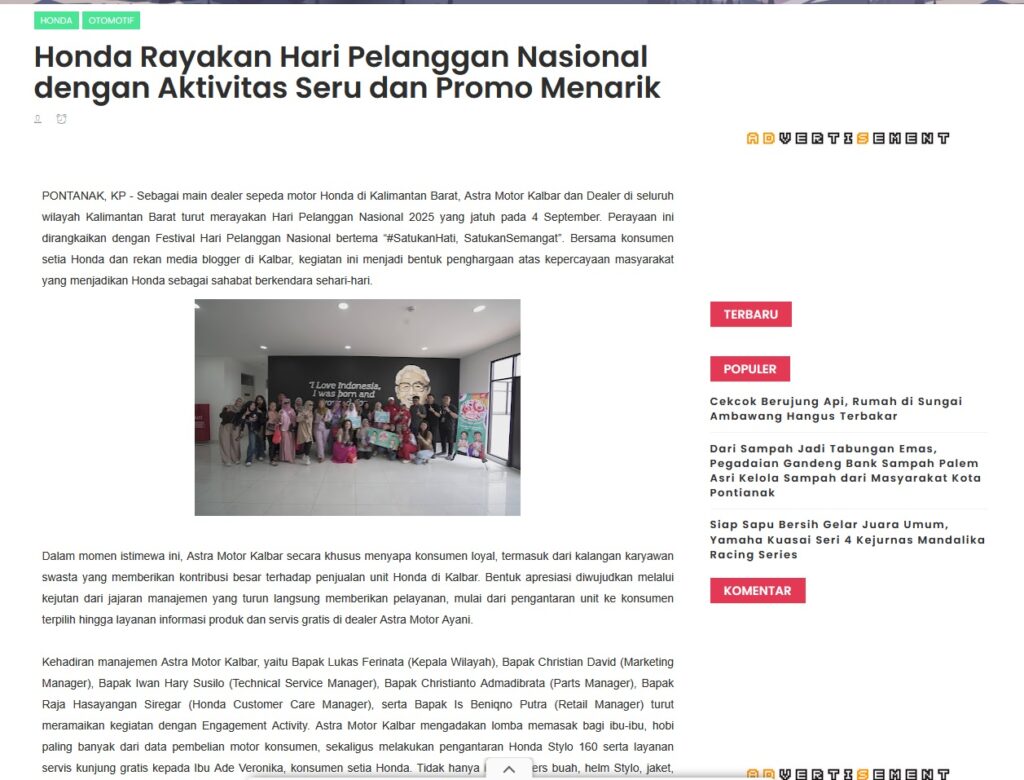 Honda Rayakan Hari Pelanggan Nasional dengan Aktivitas Seru dan Promo Menarik by Muhammad Arif 21 September 2025 in Silahkan kunjungi https://www.kapuaspost.web.id/2025/09/honda-rayakan-hari-pelanggan-nasional_28.html. Tags: astra Astra Motor kalbar Astra Motor Pontianak astramotor honda kalbar pontianak sepeda motor You Might Like Regional Public Launching New ADV160 The SUV Pride Grand Launching New PCX 160 Truly Exceptional! Tetap hati-hati ya bro sist berkendara saat hujan.