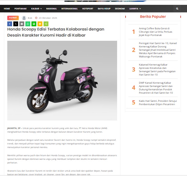 Honda Scoopy Edisi Terbatas Kolaborasi dengan Desain Karakter Kuromi Hadir di Kalbar by masmul 23 Oktober 2025 in Silahkan kunjungi https://www.suarapemredkalbar.com/read/potret/23102025/honda-scoopy-edisi-terbatas-kolaborasi-dengan-desain-karakter-kuromi-hadir-di-kalbar. You Might Like Regional Public Launching New ADV160 The SUV Pride Grand Launching New PCX 160 Truly Exceptional! Tetap hati-hati ya bro sist berkendara saat hujan.