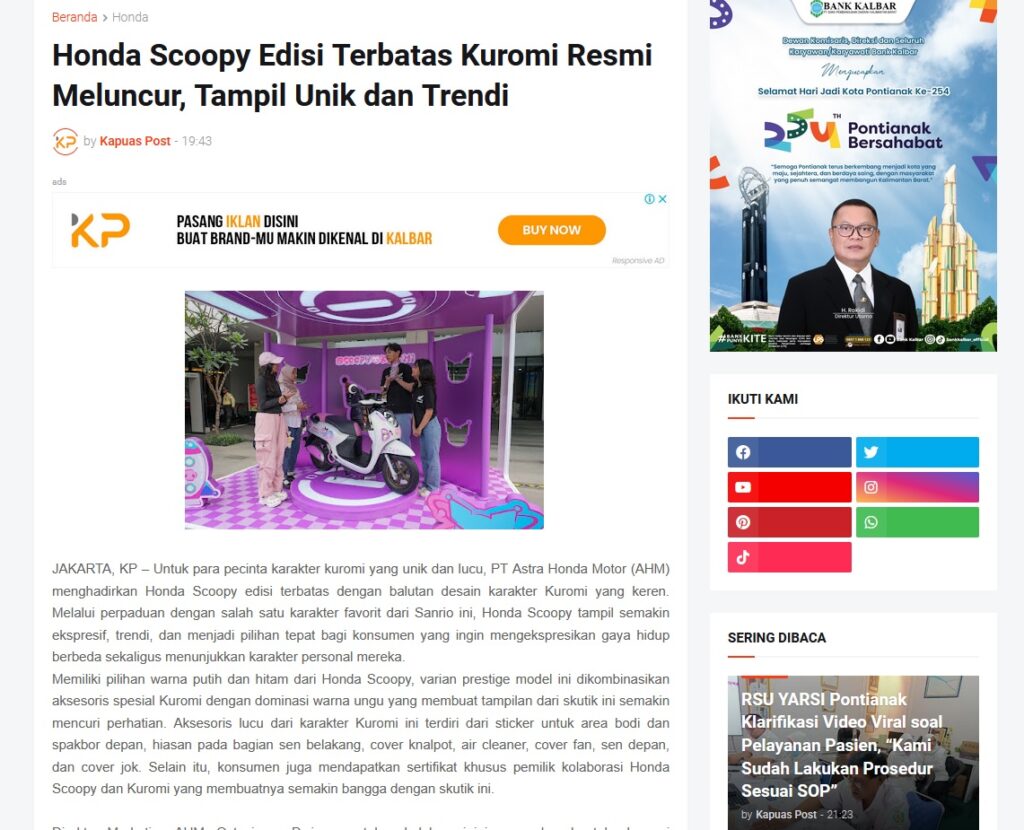 Honda Scoopy Edisi Terbatas Kuromi Resmi Meluncur, Tampil Unik dan Trendi by Muhammad Arif 11 November 2025 in Silahkan kunjungi https://www.kapuaspost.web.id/2025/11/honda-scoopy-edisi-terbatas-kuromi.html#google_vignette. Tags: astra Astra Motor kalbar Astra Motor Pontianak astramotor honda kalbar pontianak sepeda motor You Might Like Regional Public Launching New ADV160 The SUV Pride Grand Launching New PCX 160 Truly Exceptional! Tetap hati-hati ya bro sist berkendara saat hujan.