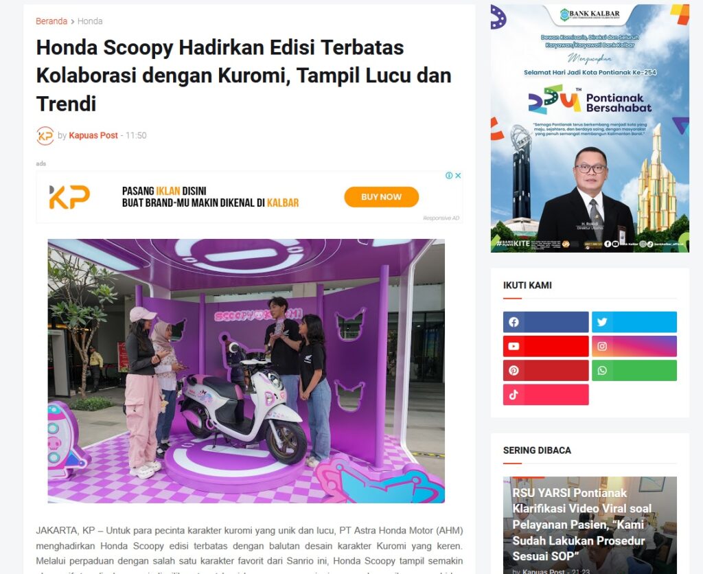 Honda Scoopy Hadirkan Edisi Terbatas Kolaborasi dengan Kuromi, Tampil Lucu dan Trendi by Muhammad Arif 24 Oktober 2025 in Silahkan kunjungi https://www.kapuaspost.web.id/2025/10/honda-scoopy-hadirkan-edisi-terbatas.html. Tags: astra Astra Motor kalbar Astra Motor Pontianak astramotor honda kalbar pontianak sepeda motor You Might Like Regional Public Launching New ADV160 The SUV Pride Grand Launching New PCX 160 Truly Exceptional! Tetap hati-hati ya bro sist berkendara saat hujan.