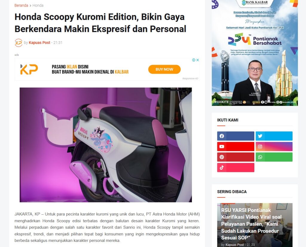 Honda Scoopy Kuromi Edition, Bikin Gaya Berkendara Makin Ekspresif dan Personal by Muhammad Arif 15 Oktober 2025 in Silahkan kunjungi https://www.kapuaspost.web.id/2025/10/honda-scoopy-kuromi-edition-bikin-gaya.html. Tags: astra Astra Motor kalbar Astra Motor Pontianak astramotor honda kalbar pontianak sepeda motor You Might Like Regional Public Launching New ADV160 The SUV Pride Grand Launching New PCX 160 Truly Exceptional! Tetap hati-hati ya bro sist berkendara saat hujan.