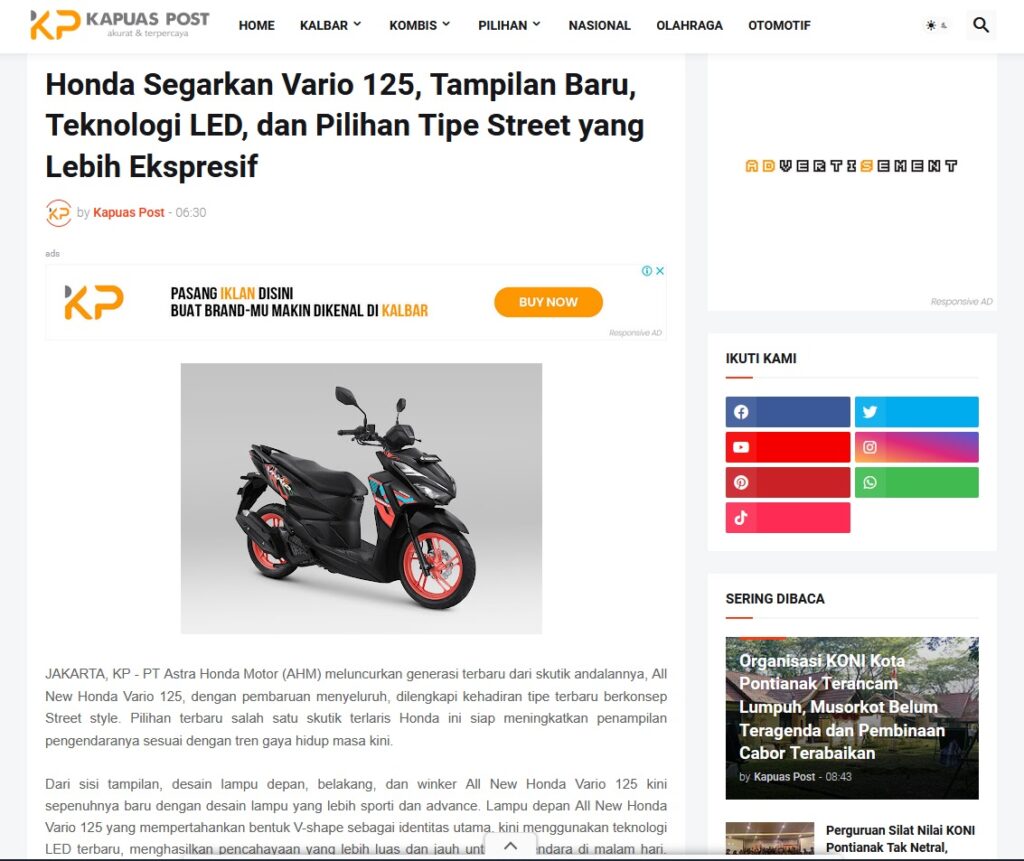 Honda Segarkan Vario 125, Tampilan Baru, Teknologi LED, dan Pilihan Tipe Street yang Lebih Ekspresif by Muhammad Arif 10 Desember 2025 in Silahkan kunjungi https://www.kapuaspost.web.id/2025/12/honda-segarkan-vario-125-tampilan-baru.html. Tags: astra Astra Motor kalbar Astra Motor Pontianak astramotor honda kalbar pontianak sepeda motor You Might Like Regional Public Launching New ADV160 The SUV Pride Grand Launching New PCX 160 Truly Exceptional! Tetap hati-hati ya bro sist berkendara saat hujan.