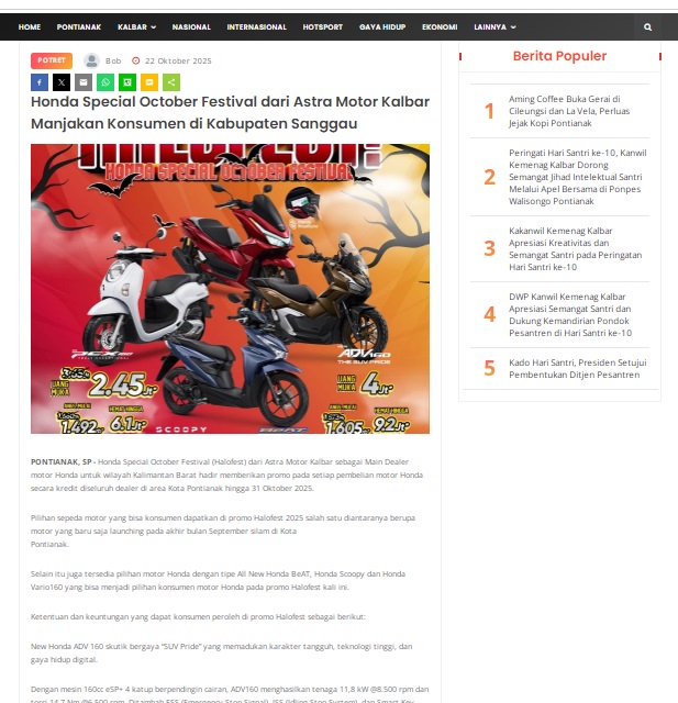 Honda Special October Festival dari Astra Motor Kalbar Manjakan Konsumen di Kabupaten Sanggau by masmul 22 Oktober 2025 in Silahkan kunjungi https://www.suarapemredkalbar.com/read/potret/22102025/honda-special-october-festival-dari-astra-motor-kalbar-manjakan-konsumen-di-kabupaten-sanggau. You Might Like Regional Public Launching New ADV160 The SUV Pride Grand Launching New PCX 160 Truly Exceptional! Tetap hati-hati ya bro sist berkendara saat hujan.