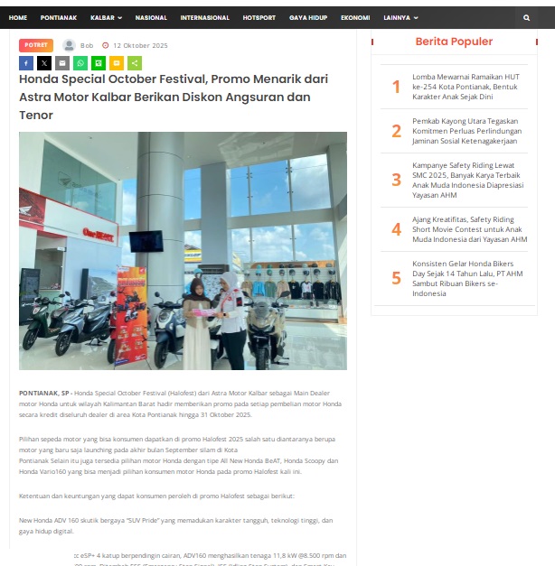 Honda Special October Festival, Promo Menarik dari Astra Motor Kalbar Berikan Diskon Angsuran dan Tenor by masmul 12 Oktober 2025 in Silahkan kunjungi https://www.suarapemredkalbar.com/read/potret/12102025/honda-special-october-festival-promo-menarik-dari-astra-motor-kalbar-berikan-diskon-angsuran-dan-tenor. You Might Like Regional Public Launching New ADV160 The SUV Pride Grand Launching New PCX 160 Truly Exceptional! Tetap hati-hati ya bro sist berkendara saat hujan.