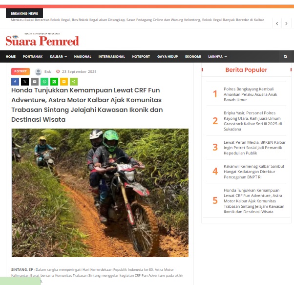 Honda Tunjukkan Kemampuan Lewat CRF Fun Adventure, Astra Motor Kalbar Ajak Komunitas Trabasan Sintang Jelajahi Kawasan Ikonik dan Destinasi Wisata by masmul 23 September 2025 in Silahkan kunjungi https://www.suarapemredkalbar.com/read/potret/23092025/honda-tunjukkan-kemampuan-lewat-crf-fun-adventure-astra-motor-kalbar-ajak-komunitas-trabasan-sintang-jelajahi-kawasan-ikonik-dan-destinasi-wisata. You Might Like Regional Public Launching New ADV160 The SUV Pride Grand Launching New PCX 160 Truly Exceptional! Tetap hati-hati ya bro sist berkendara saat hujan.