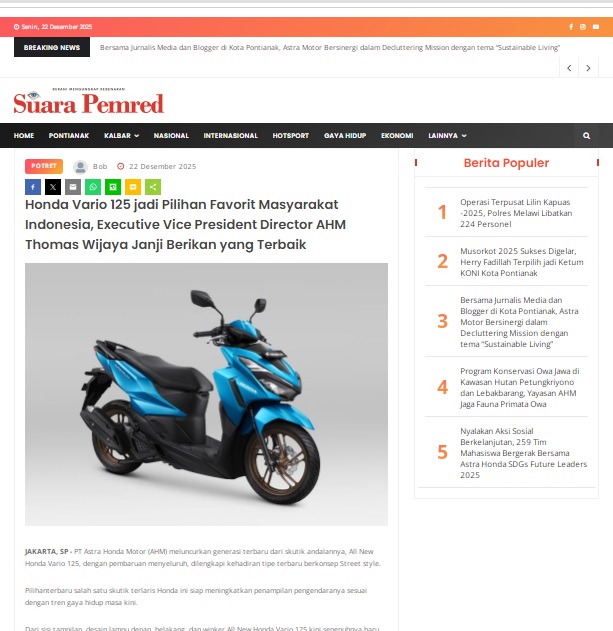 Honda Vario 125 jadi Pilihan Favorit Masyarakat Indonesia, Executive Vice President Director AHM Thomas Wijaya Janji Berikan yang Terbaik by masmul 22 Desember 2025 in Silahkan kunjungi https://www.suarapemredkalbar.com/read/potret/22122025/honda-vario-125-jadi-pilihan-favorit-masyarakat-indonesia-executive-vice-president-director-ahm-thomas-wijaya-janji-berikan-yang-terbaik. You Might Like Regional Public Launching New ADV160 The SUV Pride Grand Launching New PCX 160 Truly Exceptional! Tetap hati-hati ya bro sist berkendara saat hujan.