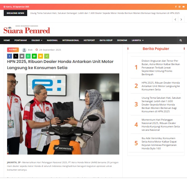 HPN 2025, Ribuan Dealer Honda Antarkan Unit Motor Langsung ke Konsumen Setia by masmul 24 September 2025 in Silahkan kunjungi https://www.suarapemredkalbar.com/read/potret/24092025/hpn-2025-ribuan-dealer-honda-antarkan-unit-motor-langsung-ke-konsumen-setia. You Might Like Regional Public Launching New ADV160 The SUV Pride Grand Launching New PCX 160 Truly Exceptional! Tetap hati-hati ya bro sist berkendara saat hujan.