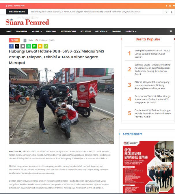 Hubungi Lewat Hotline 0811-5696-222 Melalui SMS ataupun Telepon, Teknisi AHASS Kalbar Segera Merapat by masmul 19 Maret 2025 in Silahkan kunjungi https://www.suarapemredkalbar.com/read/potret/19032025/hubungi-lewat-hotline-0811-5696-222-melalui-sms-ataupun-telepon-teknisi-ahass-kalbar-segera-merapat. You Might Like Regional Public Launching New ADV160 The SUV Pride Grand Launching New PCX 160 Truly Exceptional! Tetap hati-hati ya bro sist berkendara saat hujan.