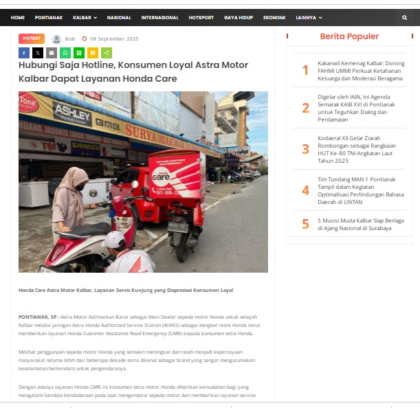 Hubungi Saja Hotline, Konsumen Loyal Astra Motor Kalbar Dapat Layanan Honda Care by masmul 8 September 2025 in Silahkan kunjungi https://www.suarapemredkalbar.com/read/potret/08092025/hubungi-saja-hotline-konsumen-loyal-astra-motor-kalbar-dapat-layanan-honda-care. You Might Like Regional Public Launching New ADV160 The SUV Pride Grand Launching New PCX 160 Truly Exceptional! Tetap hati-hati ya bro sist berkendara saat hujan.