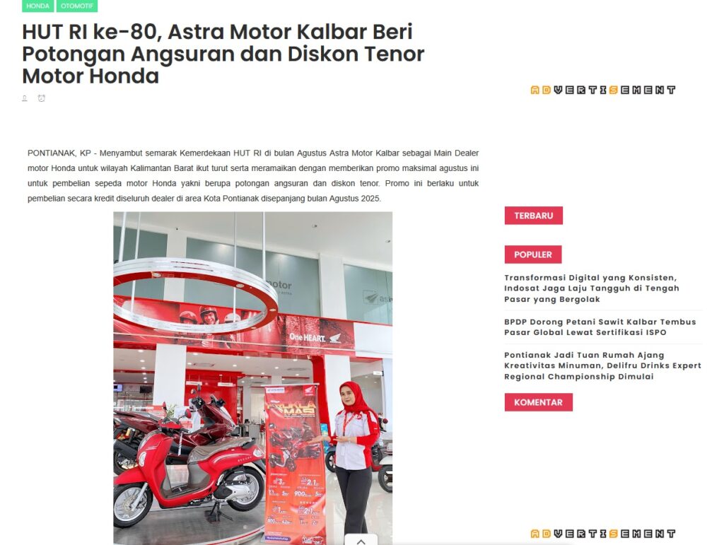 HUT RI ke-80, Astra Motor Kalbar Beri Potongan Angsuran dan Diskon Tenor Motor Honda by Muhammad Arif 24 Agustus 2025 in Silahkan kunjungi https://www.kapuaspost.web.id/2025/08/hut-ri-ke-80-astra-motor-kalbar-beri.html. Tags: astra Astra Motor kalbar Astra Motor Pontianak astramotor honda kalbar pontianak sepeda motor You Might Like Regional Public Launching New ADV160 The SUV Pride Grand Launching New PCX 160 Truly Exceptional! Tetap hati-hati ya bro sist berkendara saat hujan.