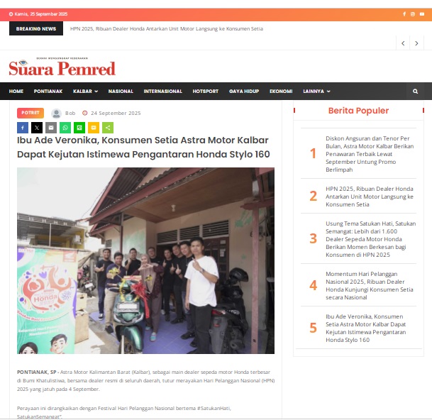 Ibu Ade Veronika, Konsumen Setia Astra Motor Kalbar Dapat Kejutan Istimewa Pengantaran Honda Stylo 160 by masmul 24 September 2025 in Silahkan kunjungi https://www.suarapemredkalbar.com/read/potret/24092025/ibu-ade-veronika-konsumen-setia-astra-motor-kalbar-dapat-kejutan-istimewa-pengantaran-honda-stylo-160. You Might Like Regional Public Launching New ADV160 The SUV Pride Grand Launching New PCX 160 Truly Exceptional! Tetap hati-hati ya bro sist berkendara saat hujan.
