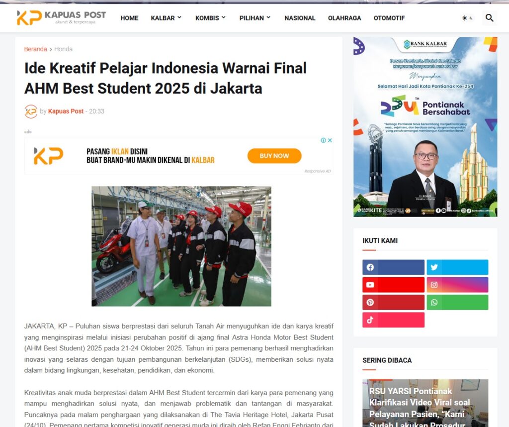Ide Kreatif Pelajar Indonesia Warnai Final AHM Best Student 2025 di Jakarta by Muhammad Arif 29 Oktober 2025 in Silahkan kunjungi https://www.kapuaspost.web.id/2025/10/ide-kreatif-pelajar-indonesia-warnai.html. Tags: astra Astra Motor kalbar Astra Motor Pontianak astramotor honda kalbar pontianak sepeda motor You Might Like Regional Public Launching New ADV160 The SUV Pride Grand Launching New PCX 160 Truly Exceptional! Tetap hati-hati ya bro sist berkendara saat hujan.