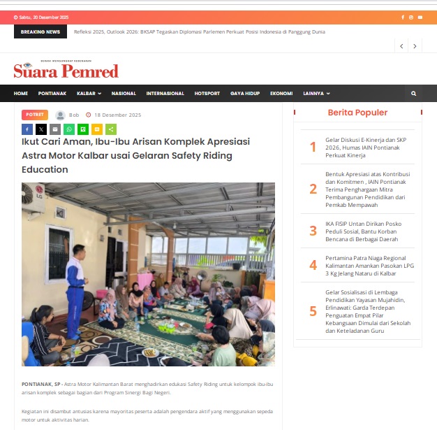 Ikut Cari Aman, Ibu-Ibu Arisan Komplek Apresiasi Astra Motor Kalbar usai Gelaran Safety Riding Education by masmul 18 Desember 2025 in Silahkan kunjungi https://www.suarapemredkalbar.com/read/potret/18122025/ikut-cari-aman-ibu-ibu-arisan-komplek-apresiasi-astra-motor-kalbarusai-gelaran-safety-riding-education. You Might Like Regional Public Launching New ADV160 The SUV Pride Grand Launching New PCX 160 Truly Exceptional! Tetap hati-hati ya bro sist berkendara saat hujan.