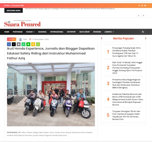 Ikuti Honda Experience, Jurnalis dan Blogger Dapatkan Edukasi Safety Riding dari Instruktur Muhammad Fathur Aziq by masmul 13 November 2025 in Silahkan kunjungi https://www.suarapemredkalbar.com/read/potret/13112025/ikuti-honda-experience-jurnalis-dan-blogger-dapatkan-edukasi-safety-riding-dari-instruktur-muhammad-fathur-aziq. You Might Like Regional Public Launching New ADV160 The SUV Pride Grand Launching New PCX 160 Truly Exceptional! Tetap hati-hati ya bro sist berkendara saat hujan.