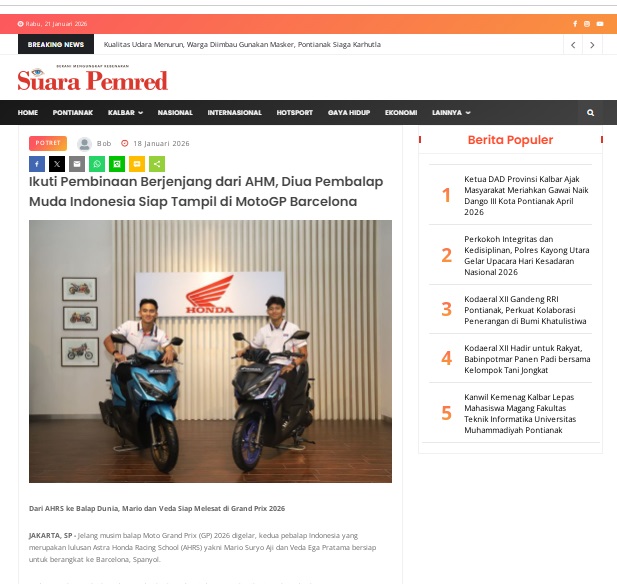 Ikuti Pembinaan Berjenjang dari AHM, Diua Pembalap Muda Indonesia Siap Tampil di MotoGP Barcelona by masmul 18 Januari 2026 in Silahkan kunjungi https://www.suarapemredkalbar.com/read/potret/18012026/ikuti-pembinaan-berjenjang-dari-ahm-diua-pembalap-muda-indonesia-siap-tampil-di-motogp-barcelona. You Might Like Regional Public Launching New ADV160 The SUV Pride Grand Launching New PCX 160 Truly Exceptional! Tetap hati-hati ya bro sist berkendara saat hujan.