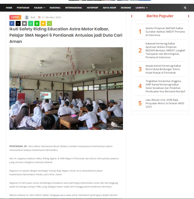 Ikuti Safety Riding Education Astra Motor Kalbar, Pelajar SMA Negeri 6 Pontianak Antusias jadi Duta Cari Aman by masmul 21 Oktober 2025 in Silahkan kunjungi https://www.suarapemredkalbar.com/read/potret/21102025/ikuti-safety-riding-education-astra-motor-kalbar-pelajar-sma-negeri-6-pontianak-antusias-jadi-duta-cari-aman. You Might Like Regional Public Launching New ADV160 The SUV Pride Grand Launching New PCX 160 Truly Exceptional! Tetap hati-hati ya bro sist berkendara saat hujan.