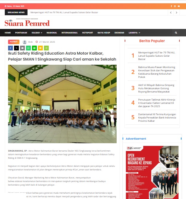 Ikuti Safety Riding Education Astra Motor Kalbar, Pelajar SMAN 1 Singkawang Siap Cari aman ke Sekolah by masmul 21 Maret 2025 in Silahkan kunjungi https://www.suarapemredkalbar.com/read/potret/21032025/ikuti-safety-riding-education-astra-motor-kalbar-pelajar-sman-1-singkawang-siap-cari-aman-ke-sekolah. You Might Like Regional Public Launching New ADV160 The SUV Pride Grand Launching New PCX 160 Truly Exceptional! Tetap hati-hati ya bro sist berkendara saat hujan.