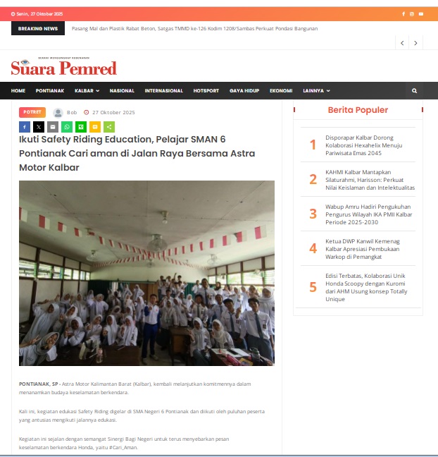 Ikuti Safety Riding Education, Pelajar SMAN 6 Pontianak Cari aman di Jalan Raya Bersama Astra Motor Kalbar by masmul 27 Oktober 2025 in Silahkan kunjungi https://www.suarapemredkalbar.com/read/potret/27102025/ikuti-safety-riding-education-pelajar-sman-6-pontianak-cari-aman-di-jalan-raya-bersama-astra-motor-kalbar. You Might Like Regional Public Launching New ADV160 The SUV Pride Grand Launching New PCX 160 Truly Exceptional! Tetap hati-hati ya bro sist berkendara saat hujan.
