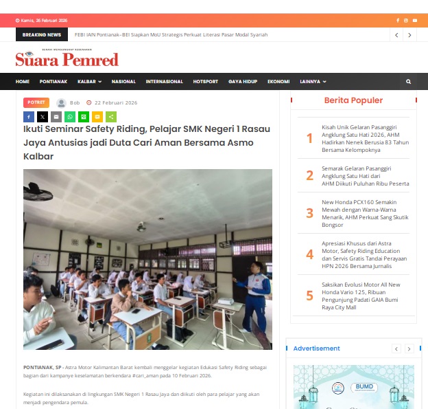 Ikuti Seminar Safety Riding, Pelajar SMK Negeri 1 Rasau Jaya Antusias jadi Duta Cari Aman Bersama Asmo Kalbar by masmul 22 Februari 2026 in Silahkan kunjungi https://www.suarapemredkalbar.com/read/potret/22022026/ikuti-seminar-safety-riding-pelajar-smk-negeri-1-rasau-jaya-antusias-jadi-duta-cari-amanbersama-asmo-kalbar. You Might Like Regional Public Launching New ADV160 The SUV Pride Grand Launching New PCX 160 Truly Exceptional! Tetap hati-hati ya bro sist berkendara saat hujan.