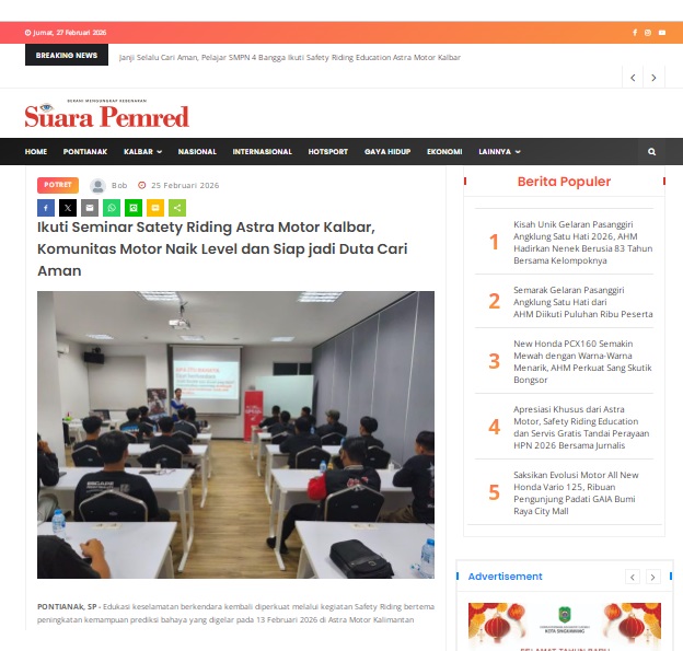 Ikuti Seminar Satety Riding Astra Motor Kalbar, Komunitas Motor Naik Level dan Siap jadi Duta Cari Aman by masmul 25 Februari 2026 in Silahkan kunjungi https://www.suarapemredkalbar.com/read/potret/25022026/ikuti-seminar-satety-riding-astra-motor-kalbar-komunitas-motor-naik-level-dan-siap-jadi-duta-cari-aman. You Might Like Regional Public Launching New ADV160 The SUV Pride Grand Launching New PCX 160 Truly Exceptional! Tetap hati-hati ya bro sist berkendara saat hujan.