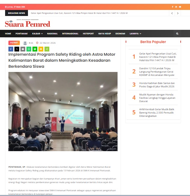 Implementasi Program Safety Riding oleh Astra Motor Kalimantan Barat dalam Meningkatkan Kesadaran Berkendara Siswa by masmul 22 Maret 2026 in Silahkan kunjungi https://www.suarapemredkalbar.com/read/potret/22032026/implementasi-program-safety-riding-oleh-astra-motor-kalimantan-barat-dalam-meningkatkan-kesadaran-berkendara-siswa. You Might Like Regional Public Launching New ADV160 The SUV Pride Grand Launching New PCX 160 Truly Exceptional! Tetap hati-hati ya bro sist berkendara saat hujan.