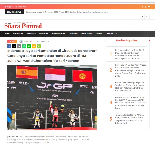 Indonesia Raya Berkumandang di Circuit de Barcelona-Catalunya Berkat Pembalap Honda Juara di FIM JuniorGP World Championship Seri Keenam by masmul 15 November 2025 in Silahkan kunjungi https://www.suarapemredkalbar.com/read/potret/15112025/indonesia-raya-berkumandan-di-circuit-de-barcelona-catalunya-berkat-pembalap-honda-juara-di-fim-juniorgp-world-championship-seri-keenam. You Might Like Regional Public Launching New ADV160 The SUV Pride Grand Launching New PCX 160 Truly Exceptional! Tetap hati-hati ya bro sist berkendara saat hujan.