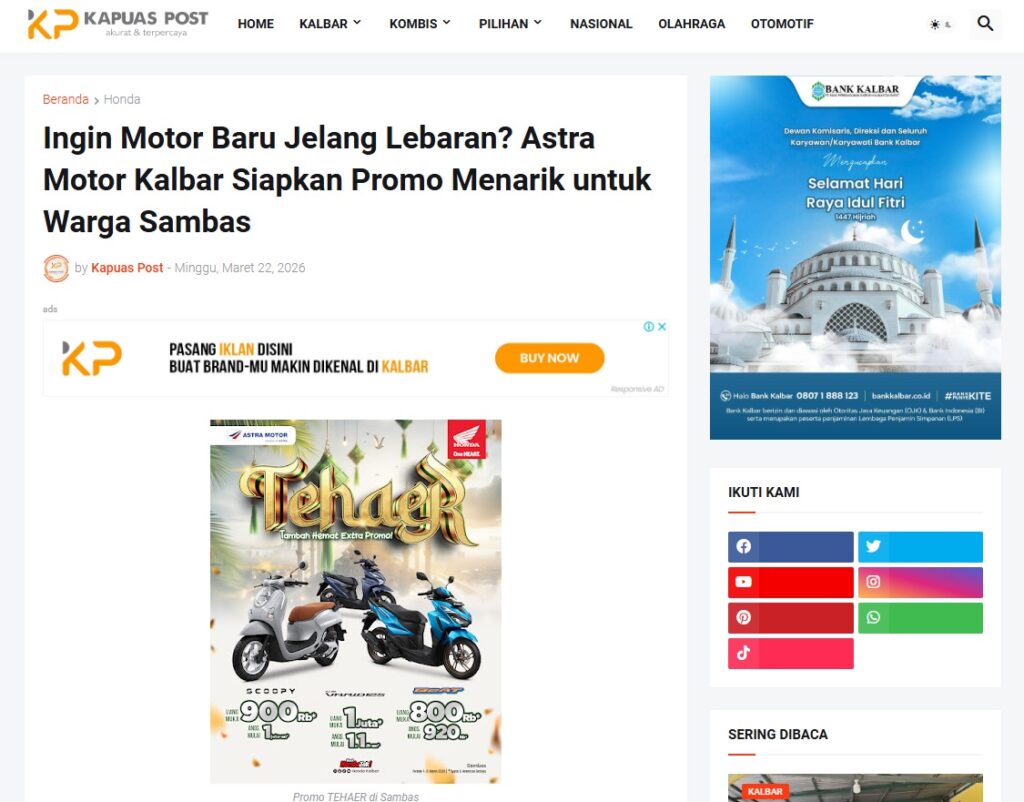 Ingin Motor Baru Jelang Lebaran? Astra Motor Kalbar Siapkan Promo Menarik untuk Warga Sambas by Muhammad Arif 22 Maret 2026 in Silahkan kunjungi https://www.kapuaspost.web.id/2026/03/ingin-motor-baru-jelang-lebaran-astra.html. Tags: astra Astra Motor kalbar Astra Motor Pontianak astramotor honda kalbar pontianak sepeda motor You Might Like Regional Public Launching New ADV160 The SUV Pride Grand Launching New PCX 160 Truly Exceptional! Tetap hati-hati ya bro sist berkendara saat hujan.