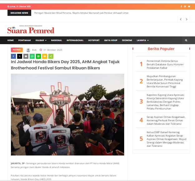 Ini Jadwal Honda Bikers Day 2025, AHM Angkat Tajuk Brotherhood Festival Sambut Ribuan Bikers by masmul 31 Oktober 2025 in Silahkan kunjungi https://www.suarapemredkalbar.com/read/potret/31102025/ini-jadwal-honda-bikers-day-2025-ahm-angkat-tajuk-brotherhood-festival-sambut-ribuan-bikers. You Might Like Regional Public Launching New ADV160 The SUV Pride Grand Launching New PCX 160 Truly Exceptional! Tetap hati-hati ya bro sist berkendara saat hujan.