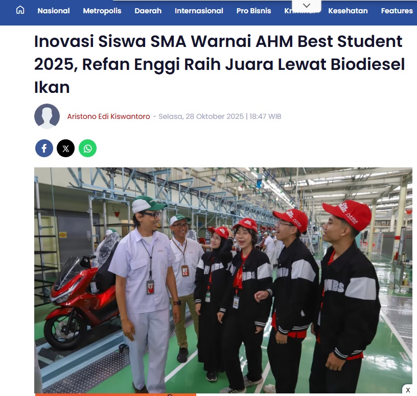 Inovasi Siswa SMA Warnai AHM Best Student 2025, Refan Enggi Raih Juara Lewat Biodiesel Ikan by Aristono Edi Kiswantoro 28 Oktober 2025 in Silahkan kunjungi https://pontianakpost.jawapos.com/pro-bisnis/1466760248/inovasi-siswa-sma-warnai-ahm-best-student-2025-refan-enggi-raih-juara-lewat-biodiesel-ikan. You Might Like Regional Public Launching New ADV160 The SUV Pride Grand Launching New PCX 160 Truly Exceptional! Tetap hati-hati ya bro sist berkendara saat hujan.