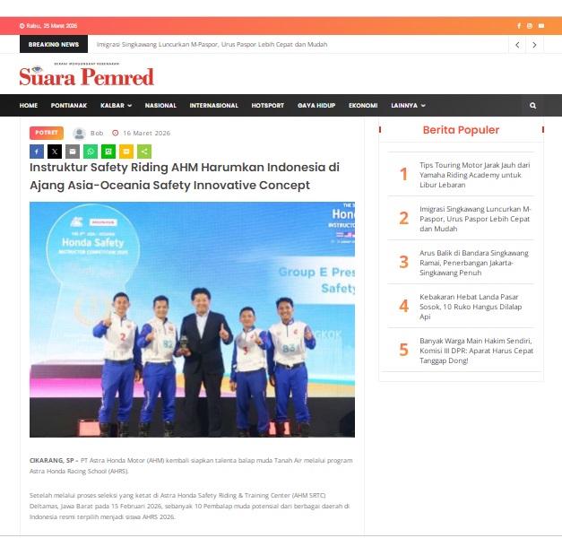 Instruktur Safety Riding AHM Harumkan Indonesia di Ajang Asia-Oceania Safety Innovative Concept by masmul 16 Maret 2026 in Silahkan kunjungi https://www.suarapemredkalbar.com/read/potret/16032026/instruktur-safety-riding-ahm-harumkan-indonesia-di-ajang-asia-oceania-safety-innovative-concept. You Might Like Regional Public Launching New ADV160 The SUV Pride Grand Launching New PCX 160 Truly Exceptional! Tetap hati-hati ya bro sist berkendara saat hujan.