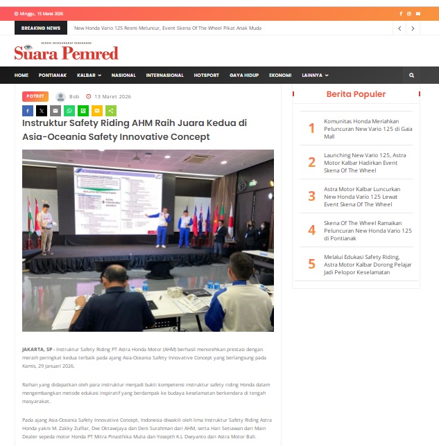 Instruktur Safety Riding AHM Raih Juara Kedua di Asia-Oceania Safety Innovative Concept by masmul 13 Maret 2026 in Silahkan kunjungi https://www.suarapemredkalbar.com/read/potret/13032026/instruktur-safety-riding-ahm-raih-juara-kedua-di-asia-oceania-safety-innovative-concept. You Might Like Regional Public Launching New ADV160 The SUV Pride Grand Launching New PCX 160 Truly Exceptional! Tetap hati-hati ya bro sist berkendara saat hujan.