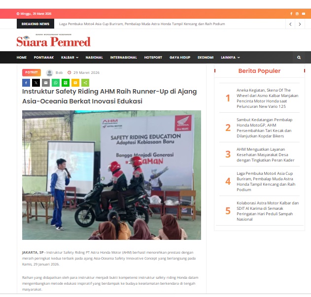 Instruktur Safety Riding AHM Raih Runner-Up di Ajang Asia-Oceania Berkat Inovasi Edukasi by masmul 29 Maret 2026 in Silahkan kunjungi https://www.suarapemredkalbar.com/read/potret/29032026/instruktur-safety-riding-ahm-raih-runner-up-di-ajang-asia-oceania-berkat-inovasi-edukasi. You Might Like Regional Public Launching New ADV160 The SUV Pride Grand Launching New PCX 160 Truly Exceptional! Tetap hati-hati ya bro sist berkendara saat hujan.