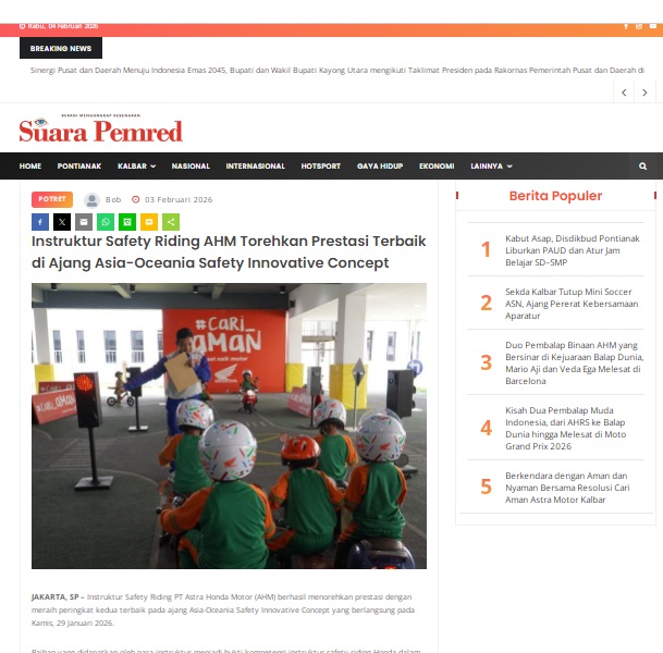 Instruktur Safety Riding AHM Torehkan Prestasi Terbaik di Ajang Asia-Oceania Safety Innovative Concept by masmul 3 Februari 2026 in Silahkan kunjungi https://www.suarapemredkalbar.com/read/potret/03022026/instruktur-safety-riding-ahm-torehkan-prestasi-terbaik-di-ajang-asia-oceania-safety-innovative-concept. You Might Like Regional Public Launching New ADV160 The SUV Pride Grand Launching New PCX 160 Truly Exceptional! Tetap hati-hati ya bro sist berkendara saat hujan.