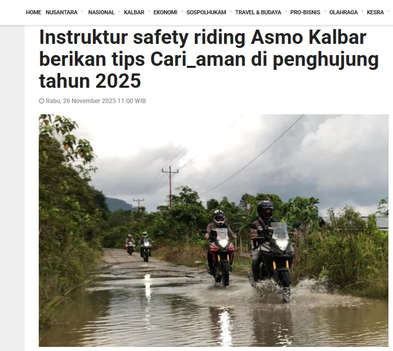 Instruktur safety riding Asmo Kalbar berikan tips Cari_aman di penghujung tahun 2025 by Dedi 26 November 2025 in Silahkan kunjungi https://kalbar.antaranews.com/berita/675409/instruktur-safety-riding-asmo-kalbar-berikan-tips-cari-aman-di-penghujung-tahun-2025. You Might Like Regional Public Launching New ADV160 The SUV Pride Grand Launching New PCX 160 Truly Exceptional! Tetap hati-hati ya bro sist berkendara saat hujan.