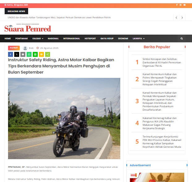 Instruktur Safety Riding, Astra Motor Kalbar Bagikan Tips Berkendara Menyambut Musim Penghujan di Bulan September by masmul 26 Agustus 2025 in Silahkan kunjungi https://www.suarapemredkalbar.com/read/potret/26082025/instruktur-safety-riding-astra-motor-kalbar-bagikan-tips-berkendara-menyambut-musim-penghujan-di-bulan-september. You Might Like Regional Public Launching New ADV160 The SUV Pride Grand Launching New PCX 160 Truly Exceptional! Tetap hati-hati ya bro sist berkendara saat hujan.