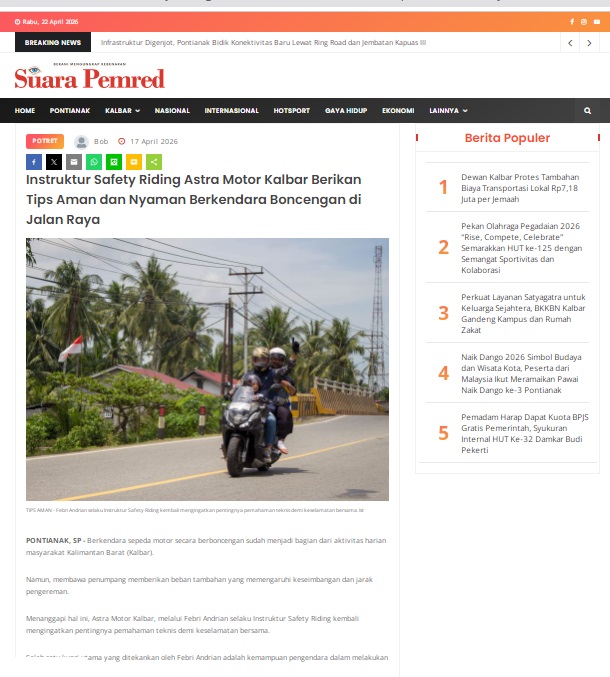 Instruktur Safety Riding Astra Motor Kalbar Berikan Tips Aman dan Nyaman Berkendara Boncengan di Jalan Raya by masmul 17 April 2026 in Silahkan kunjungi https://www.suarapemredkalbar.com/read/potret/17042026/instruktur-safety-riding-astra-motor-kalbar-berikan-tips-aman-dan-nyaman-berkendara-boncengan-di-jalan-raya. You Might Like Regional Public Launching New ADV160 The SUV Pride Grand Launching New PCX 160 Truly Exceptional! Tetap hati-hati ya bro sist berkendara saat hujan.