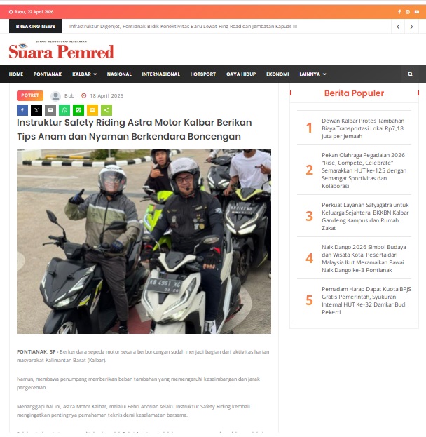 Instruktur Safety Riding Astra Motor Kalbar Berikan Tips Anam dan Nyaman Berkendara Boncengan by masmul 18 April 2026 in Silahkan kunjungi https://www.suarapemredkalbar.com/read/potret/18042026/instruktur-safety-riding-astra-motor-kalbar-berikan-tips-anam-dan-nyaman-berkendara-boncengan. You Might Like Regional Public Launching New ADV160 The SUV Pride Grand Launching New PCX 160 Truly Exceptional! Tetap hati-hati ya bro sist berkendara saat hujan.