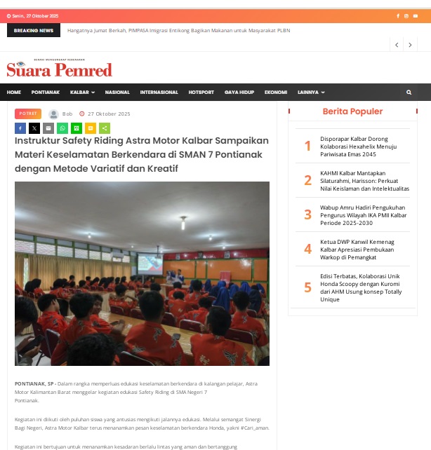 Instruktur Safety Riding Astra Motor Kalbar Sampaikan Materi Keselamatan Berkendara di SMAN 7 Pontianak dengan Metode Variatif dan Kreatif by masmul 27 Oktober 2025 in Silahkan kunjungi https://www.suarapemredkalbar.com/read/potret/27102025/instruktur-safety-riding-astra-motor-kalbar-sampaikan-materi-keselamatan-berkendara-di-sman-7-pontianak-dengan-metode-variatif-dan-kreatif. You Might Like Regional Public Launching New ADV160 The SUV Pride Grand Launching New PCX 160 Truly Exceptional! Tetap hati-hati ya bro sist berkendara saat hujan.