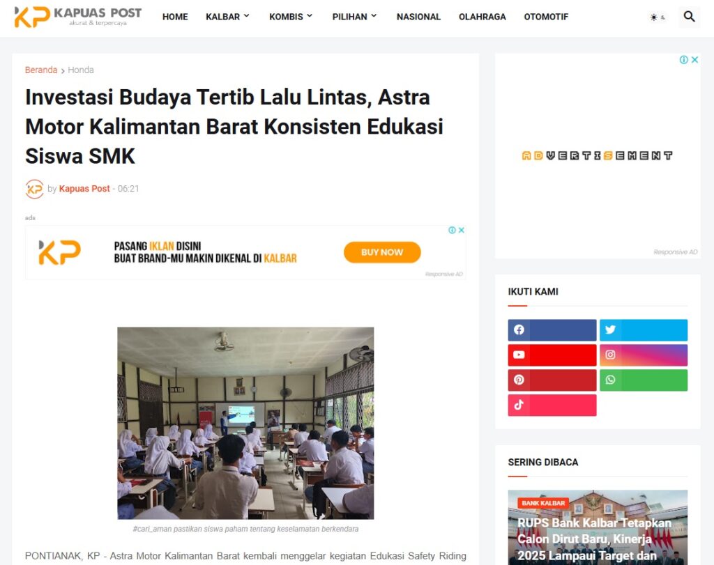 Investasi Budaya Tertib Lalu Lintas, Astra Motor Kalimantan Barat Konsisten Edukasi Siswa SMK by Muhammad Arif 27 Februari 2026 in Silahkan kunjungi https://www.kapuaspost.web.id/2026/02/investasi-budaya-tertib-lalu-lintas.html. Tags: astra Astra Motor kalbar Astra Motor Pontianak astramotor honda kalbar pontianak sepeda motor You Might Like Regional Public Launching New ADV160 The SUV Pride Grand Launching New PCX 160 Truly Exceptional! Tetap hati-hati ya bro sist berkendara saat hujan.