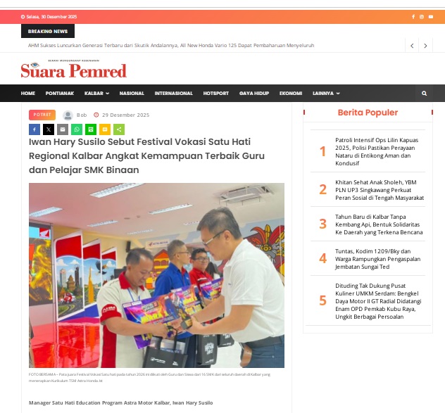 Iwan Hary Susilo Sebut Festival Vokasi Satu Hati Regional Kalbar Angkat Kemampuan Terbaik Guru dan Pelajar SMK Binaan by masmul 29 Desember 2025 in Silahkan kunjungi https://www.suarapemredkalbar.com/read/potret/29122025/iwan-hary-susilo-sebut-festival-vokasi-satu-hati-regional-kalbar-angkat-kemampuan-terbaik-guru-dan-pelajar-smk-binaan. You Might Like Regional Public Launching New ADV160 The SUV Pride Grand Launching New PCX 160 Truly Exceptional! Tetap hati-hati ya bro sist berkendara saat hujan.