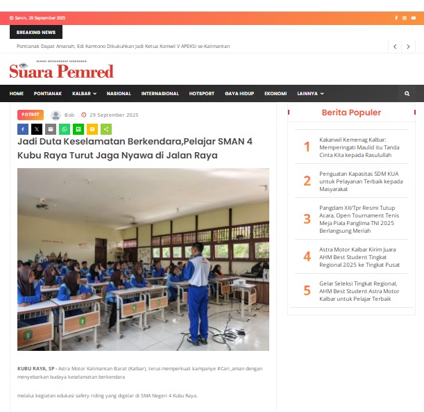 Jadi Duta Keselamatan Berkendara,Pelajar SMAN 4 Kubu Raya Turut Jaga Nyawa di Jalan Raya by masmul 29 September 2025 in Silahkan kunjungi https://www.suarapemredkalbar.com/read/potret/29092025/jadi-duta-keselamatan-berkendarapelajar-sman-4-kubu-raya-turut-jaga-nyawa-di-jalan-raya. You Might Like Regional Public Launching New ADV160 The SUV Pride Grand Launching New PCX 160 Truly Exceptional! Tetap hati-hati ya bro sist berkendara saat hujan.