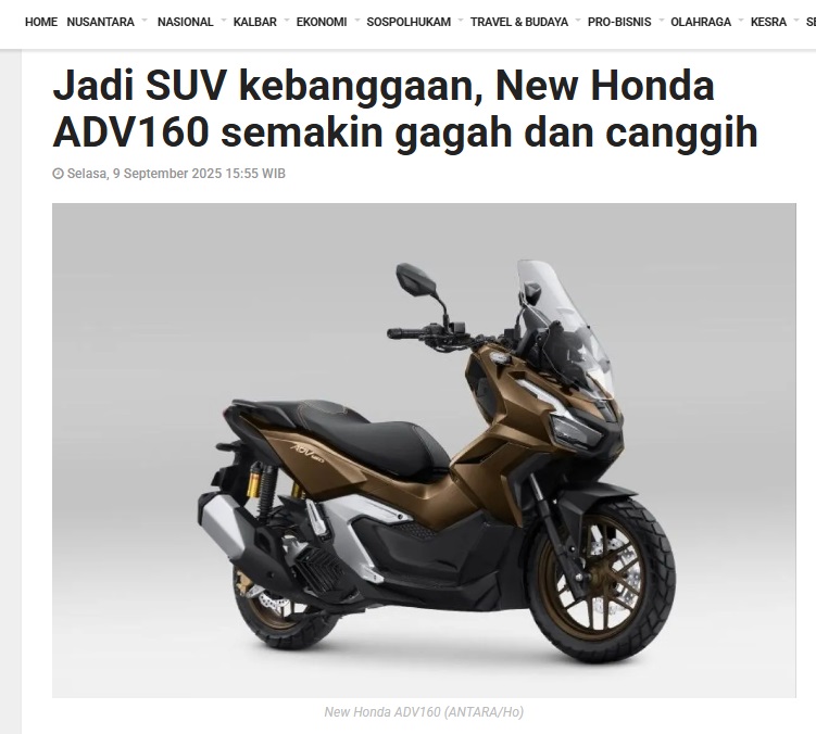Jadi SUV kebanggaan, New Honda ADV160 semakin gagah dan canggih by Dedi 9 September 2025 in Silahkan kunjungi https://kalbar.antaranews.com/berita/664921/jadi-suv-kebanggaan-new-honda-adv160-semakin-gagah-dan-canggih. You Might Like Regional Public Launching New ADV160 The SUV Pride Grand Launching New PCX 160 Truly Exceptional! Tetap hati-hati ya bro sist berkendara saat hujan.