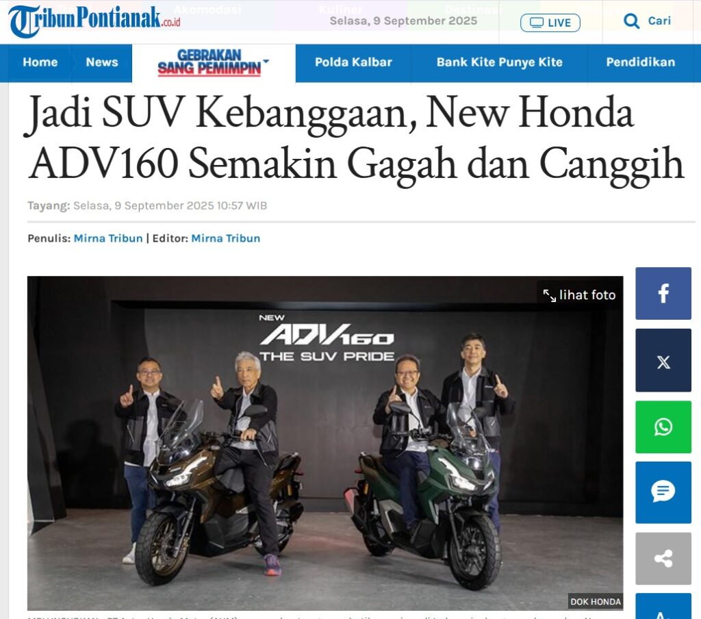 Jadi SUV Kebanggaan, New Honda ADV160 Semakin Gagah dan Canggih by Ishak Ismail 9 September 2025 in Silahkan kunjungi https://pontianak.tribunnews.com/otomotif/1139870/jadi-suv-kebanggaan-new-honda-adv160-semakin-gagah-dan-canggih. You Might Like Regional Public Launching New ADV160 The SUV Pride Grand Launching New PCX 160 Truly Exceptional! Tetap hati-hati ya bro sist berkendara saat hujan.