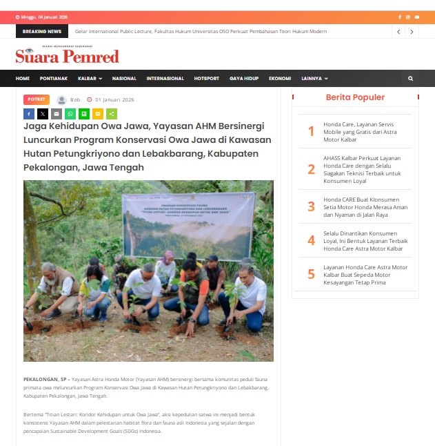 Jaga Kehidupan Owa Jawa, Yayasan AHM Bersinergi Luncurkan Program Konservasi Owa Jawa di Kawasan Hutan Petungkriyono dan Lebakbarang, Kabupaten Pekalongan, Jawa Tengah by masmul 1 Januari 2026 in Silahkan kunjungi https://www.suarapemredkalbar.com/read/potret/01012026/jaga-kehidupan-owa-jawa-yayasan-ahm-bersinergi-luncurkan-program-konservasi-owa-jawa-di-kawasan-hutan-petungkriyono-dan-lebakbarang-kabupaten-pekalongan-jawa-tengah. You Might Like Regional Public Launching New ADV160 The SUV Pride Grand Launching New PCX 160 Truly Exceptional! Tetap hati-hati ya bro sist berkendara saat hujan.
