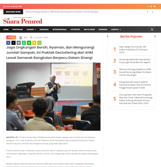 Jaga Lingkungan Bersih, Nyaman, dan Mengurangi Jumlah Sampah, Ini Praktek Decluttering dari AHM Lewat Semarak Rangkaian Berpacu Dalam Sinergi by masmul 26 Januari 2026 in Silahkan kunjungi https://www.suarapemredkalbar.com/read/potret/27012026/jaga-lingkungan-bersih-nyaman-dan-mengurangi-jumlah-sampah-ini-praktek-decluttering-dari-ahm-lewat-semarak-rangkaian-berpacu-dalam-sinergi. You Might Like Regional Public Launching New ADV160 The SUV Pride Grand Launching New PCX 160 Truly Exceptional! Tetap hati-hati ya bro sist berkendara saat hujan.
