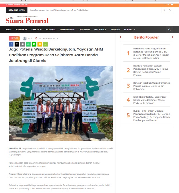 Jaga Potensi Wisata Berkelanjutan, Yayasan AHM Hadirkan Program Desa Sejahtera Astra Honda Jalatrang di Ciamis by masmul 22 Desember 2025 in Silahkan kunjungi https://www.suarapemredkalbar.com/read/potret/22122025/jaga-potensi-wisata-berkelanjutan-yayasan-ahm-hadirkan-program-desa-sejahtera-astra-honda-jalatrang-di-ciamis. You Might Like Regional Public Launching New ADV160 The SUV Pride Grand Launching New PCX 160 Truly Exceptional! Tetap hati-hati ya bro sist berkendara saat hujan.